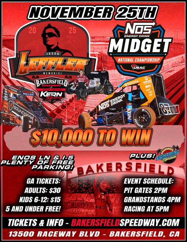 BAKERSFIELD, Calif. (November 22, 2025) – Bakersfield Speedway at Kevin Harvick’s Kern Raceway hosts the 11th annual Jason Leffler Memorial on Tuesday night November 25, featuring the USAC NOS Energy Drink National Midgets competing for $10,000 to win. The California Lightning Sprints will also be competing in their 2025 season championship race. More than 30 National Midgets will take on the one-third mile dirt track, racing in memory of Riverside, California’s Jason Leffler.