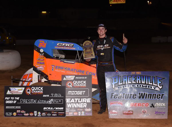PLACERVILLE, CALIFORNIA (April 19, 2026) – Arizona’s Preston Norbury scored the $1,250 feature victory for the season opener for the Bay Cities Racing Association / Western Midget Racing California Super Series presented by Quick Change Liquid Energy. Saturday night’s event at Placerville Speedway kicked off the 12 race Super Series campaign in 2026. Photo by Matt Sublett
