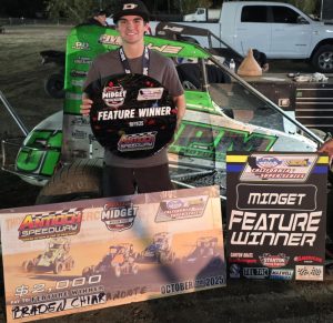 ANTIOCH, CALIFORNIA (October 12, 2025) – Braden Chiaramonte won his first career Midget feature, driving the No. 51 entry to victory in the 30-lap Open Wheel Octoberfest for the co-sanctioned WMR-BCRA-USAC feature at Antioch Speedway on Saturday night. The race served as round six for the 2025 California Midget Super Series and attracted 17 entries…