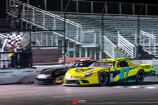 Kale McClenny scored his coveted first-career 51FIFTY Jr. Late Model win in a thrilling conclusion to a tumultuous race, steering his #07 Toyota clear of Texan Barrett Polhemus by a scant .007 seconds at the stripe.