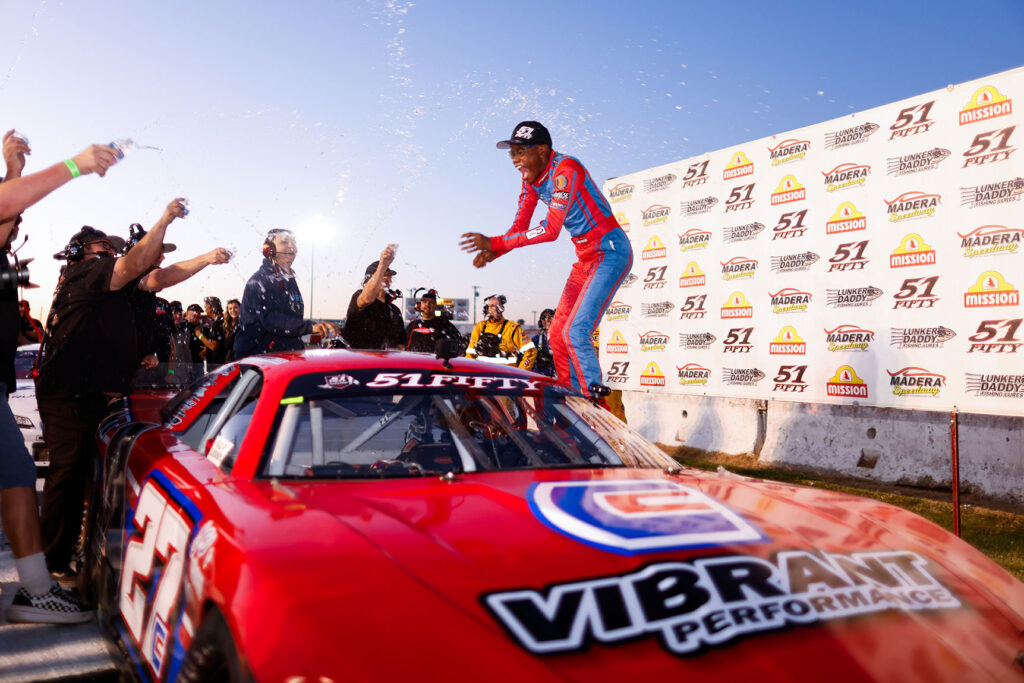 MADERA, CALIFORNIA (March 16, 2024) – Two young drivers made statement victories in a thrilling season opener for Madera Speedway, with 12-year-old Vito Cancilla becoming the youngest winner in the history of the Pro Late Model Series while 13-year-old Cam Carraway earned a coveted breakthrough win in the 51FIFTY Jr. Late Model Series. The wins came before a healthy crowd at the fastest one-third mile in the west. Photos by Ethan Smith