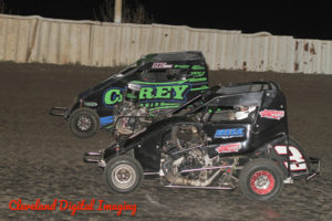 47 Non-Wing cars timed in on Saturday with Tim Vaught, the fast-time qualifier and dash winner, lining up on the pole alongside Ripon’s Brandon Carey. Carey went around the outside to lead lap one. A lap nine restart saw Carey bring the field to the green up on the top of turn four, opening the bottom for Vaught to take the lead.